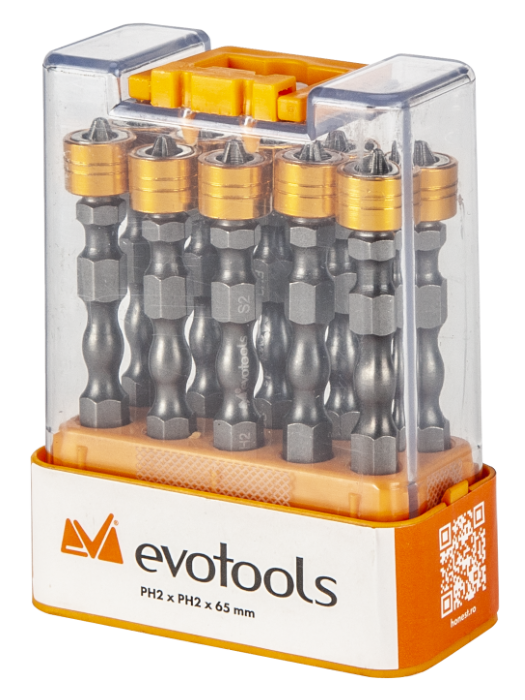 EvoTools® double-ended magnetic screwdriver bits are specially designed to make drywall work easier. Made of S2 carbon steel, a high-quality material resistant to corrosion and wear, they feature two PH2 tips each and a length of 65 mm, also useful in hard-to-reach areas. One end is equipped with an adjustable magnetic stop, spring-actuated, helping you set screw depth in drywall as needed: partially recessed, fully recessed, etc.