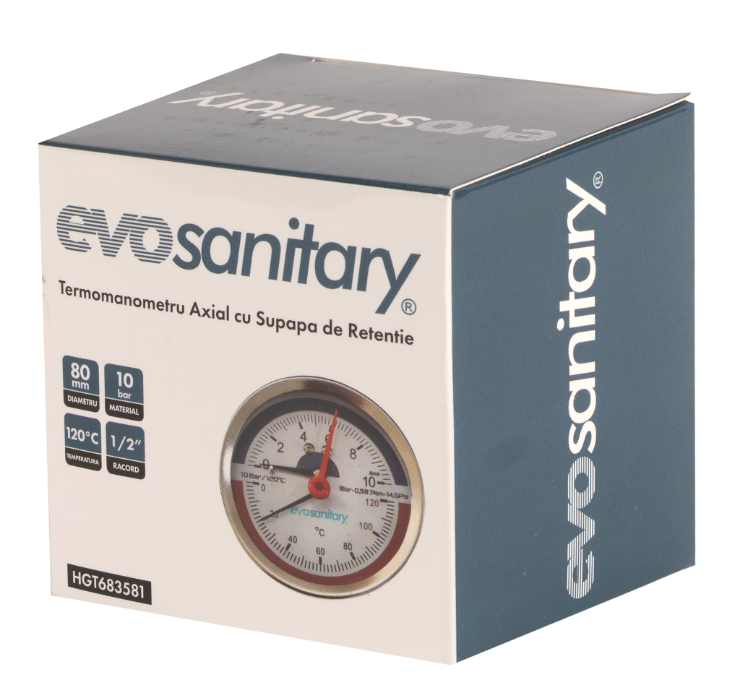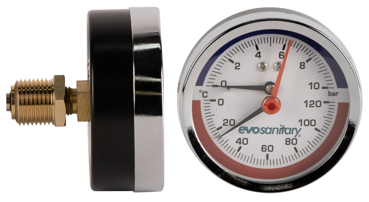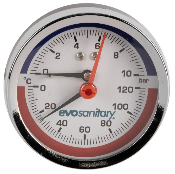 The EvoSanitary® axial thermomanometer is designed for simultaneous monitoring of pressure and temperature in heating and water supply installations. Its robust construction and quality materials ensure reliability, durability, and safe use in any system.